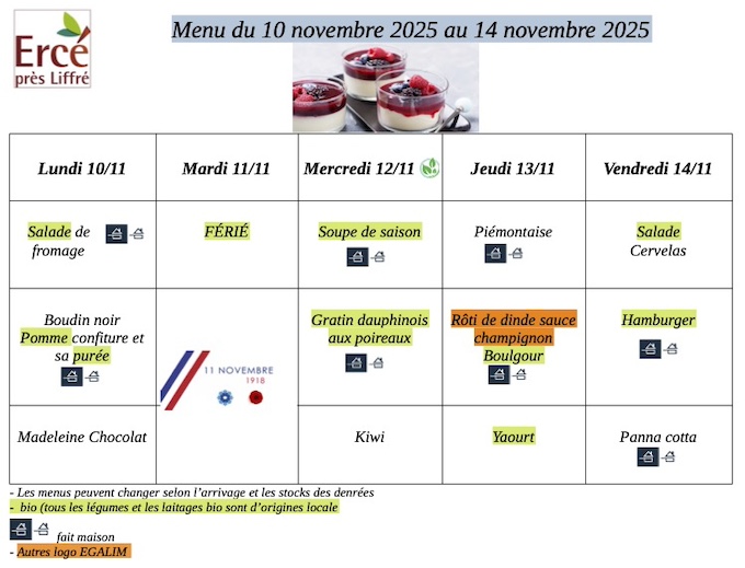 Menu du restaurant scolaire du 10 au 14 novembre 2025