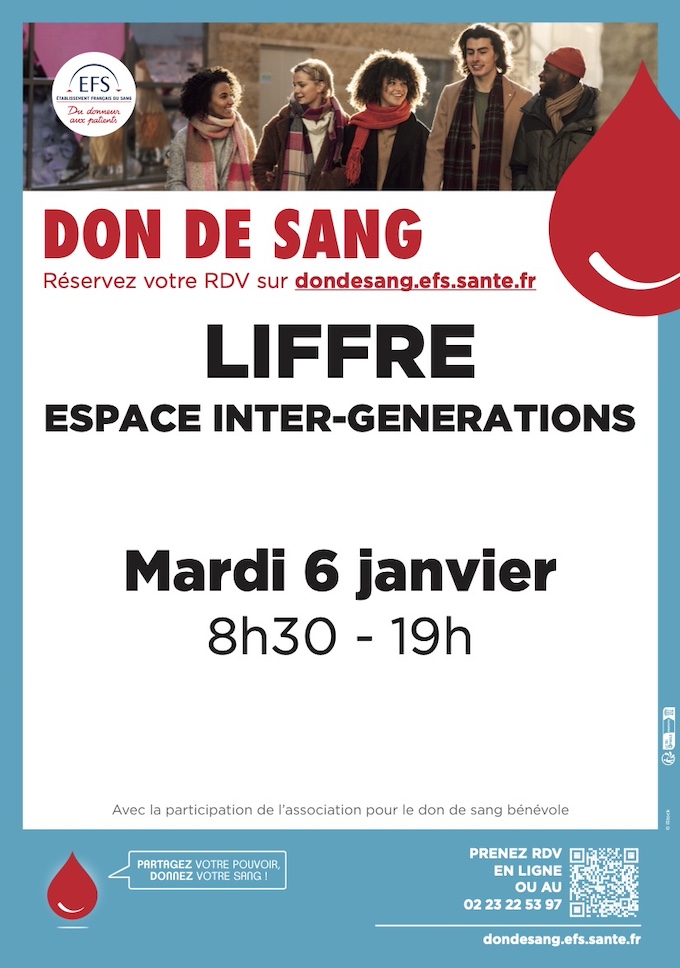 Don de sang à Liffré le 6 janvier 2026 à l'espace intergénérationnel, rue des écoles, Liffré. prendre rdv au https://efs.link/NwGt2 Suivant