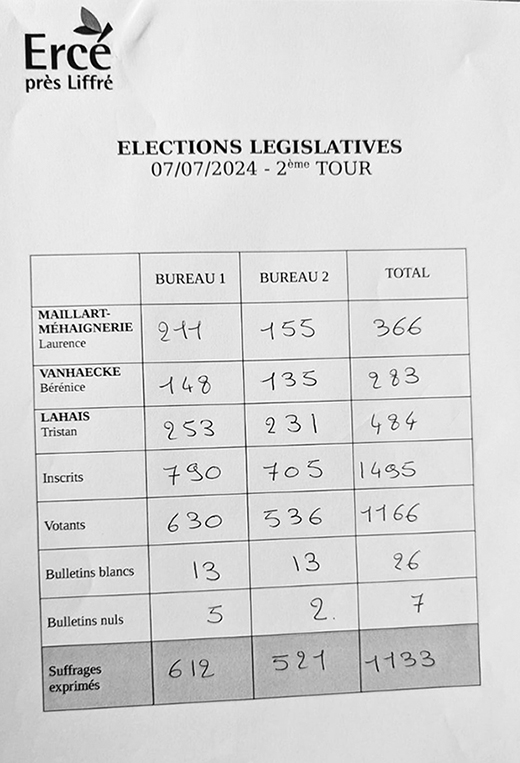 Résultats 2ème tour des législatives 2024 Ercé-près-Liffré - 2 circonscription Ille-et-Vilaine bureaux de vote 1 & 2 Suivant